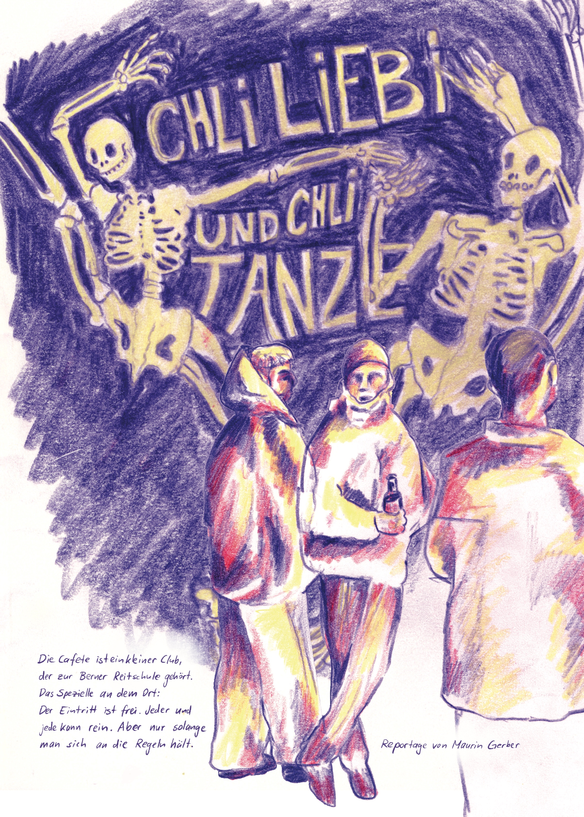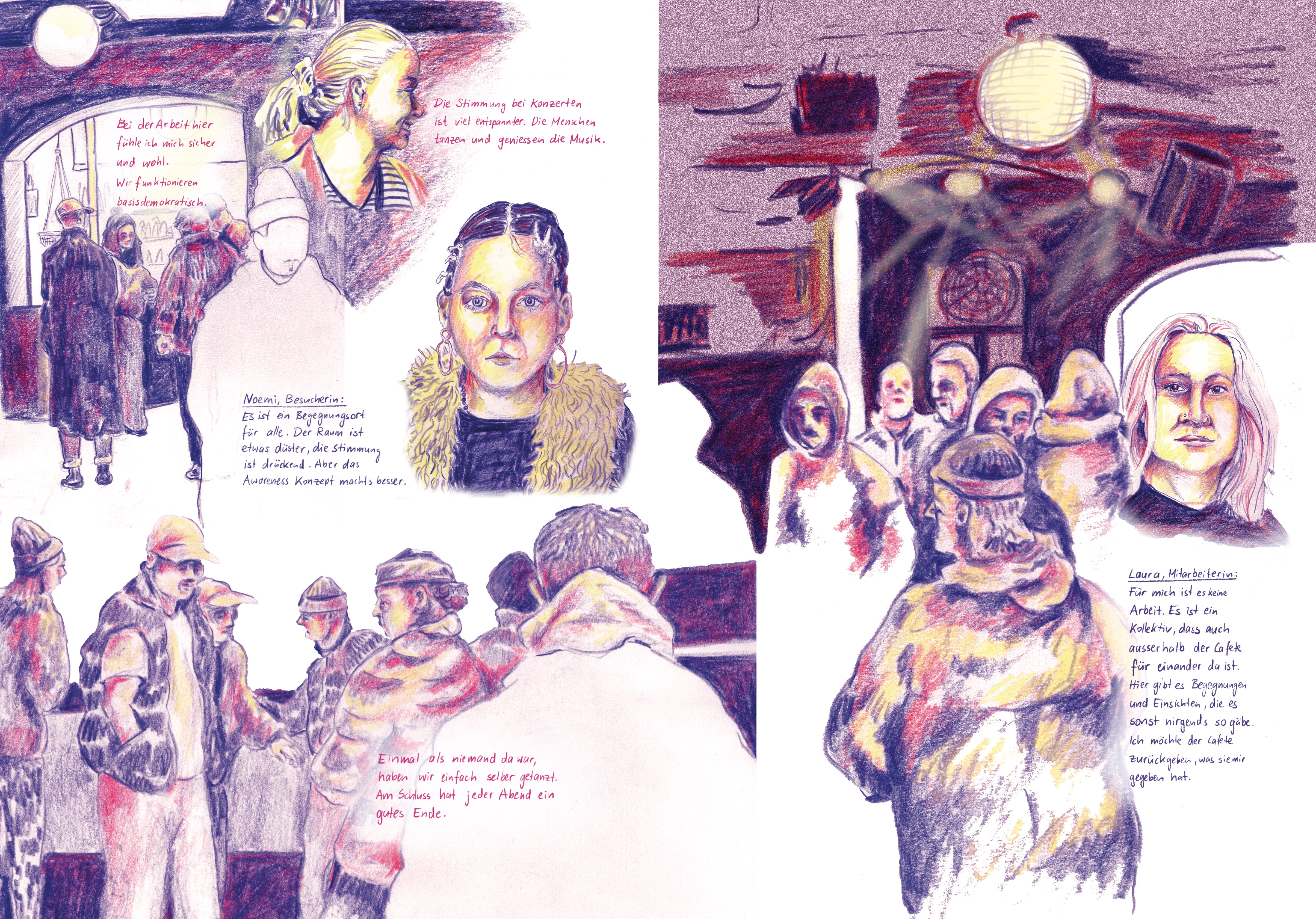 Gezeichnete Reportage über die Cafete in der Reitschule in Bern, 2023